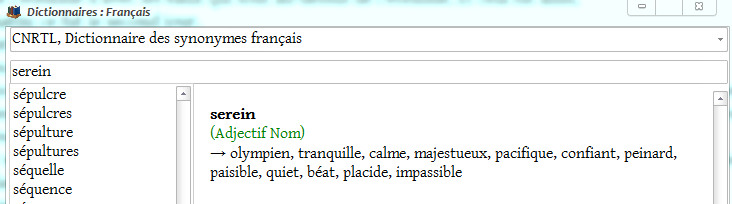 L'outil Dictionnaires pour le français s'ouvre facilement à l'aide du raccourci Ctrl + F. Les références disponibles sont les suivantes :