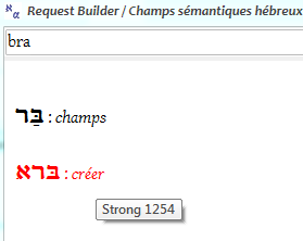 - soit en partant de l'hébreu : saisissez tout ou partie du mot hébreu, de manière transcrite et dans l'ordre français, puis espace : ex. bra :